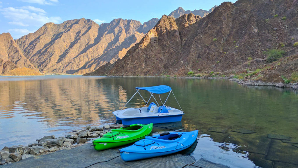 Nur wenige Autominuten entfernt können Gäste am Hatta Damm ein kleines Kayak Abenteuer erleben. Das Hatta Kayak bietet einen einmaligen Verleih von Kayaks und Tretbooten in einem malerischen Kulisse. Hier fragt man sich wirklich , ob das tatsächlich noch Dubai ist oder ob man schon in einer anderen Destination angekommen ist.