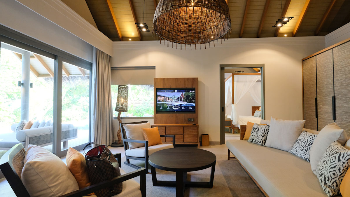 Besonders erwähnenswert ist auch die moderne Ausstattung und die Steuerung der Beleuchtung in den Villen im Vakkaru Resort. Diese erfolgt entweder manuell oder mit Hilfe eines iPads, welches den Gästen zur Verfügung steht. Hier kann tatsächlich alles einfach und schnell gesteuert werden. Insgesamt ist das Design der Villen sehr hell und modern, lichtdurchflutete Räume im im klassischen Stil mit edlen Details.