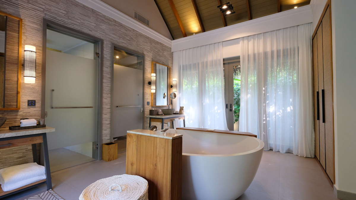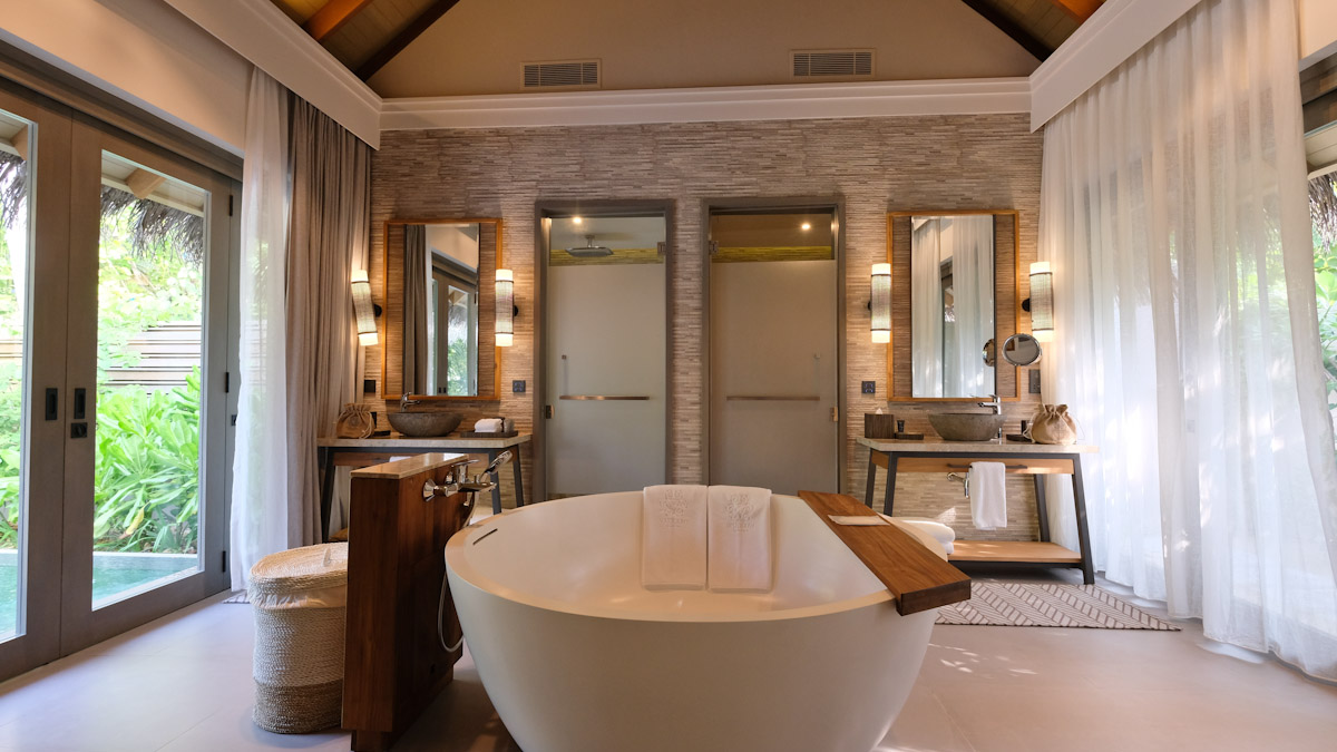 Das Badezimmer bietet ebenfalls einen Ausblick zum privaten Pool bzw. zur Terrasse und verfügt neben einer luxuriösen Badewanne eine Outdoor- Dusche und hochwertige Kosmetikprodukte für Sie und Ihn.