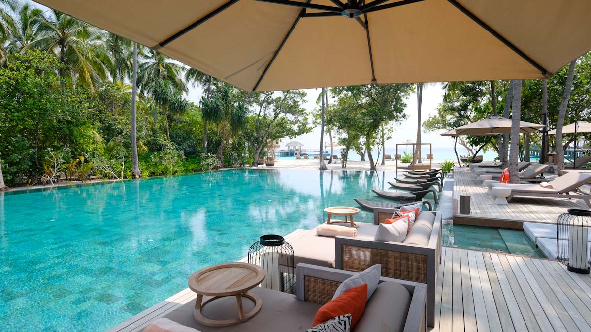 Für die Erwachsnen gibt es einen großen Pool, der an das Restaurant „Isoletta“ anschließt und einen direkten Blick zum Strand bietet. Tagesbetten und zahlreichen Sonnenliegen stehen den Gästen rund um den Pool und im Strandbereich zur Verfügung. Der Strand ist von beiden Seiten der Insel nutzbar und bietet genug Privatsphäre. Der Strandbereich auf der Seite der Beachvillen wird meist von den Gästen der Bungalows genutzt. Die Möglichkeit eines Spaziergangs rund um die Insel ist jedoch am Strand entlang gegeben, da hier kein Bereich abgeschlossen ist oder den Villen direkt zugeordnet ist. Für die kleinen Gäste verfügt der Parrot Club einen separaten Pool mit entsprechender Tiefe für Kinder.